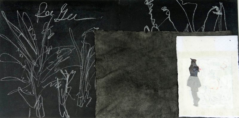 | Pee Gee 1, 2007-2013: Chalk, Chinese ink, acrylic, chlorine bleach, pigment marker, Xuan, printed and embossed rice papers, handmade Tibetan tissue, Japanese tissues, and handmade Indian paper on two blackboards (each 24 x 24 inches, total size 24 x 48 inches) |